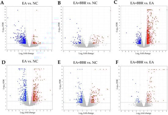 Volcano plots of differentially expressed genes. Plots (A–C) are samples from day 4 post-infection, and plots (D–F) are samples from day 6 post-infection. NC, uninfected control; EA, E. acervulina; BBR, berberine. Each dot represents a gene. Blue and red dots indicate down-regulated and up-regulated genes, respectively.