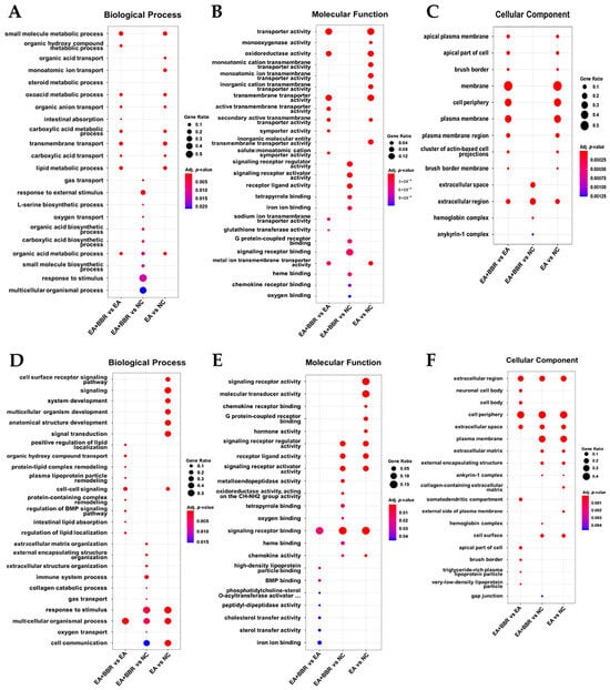Top 10 ranked GO terms from GO enrichment analysis of DEGs. Plots (A–C) are samples from day 4 post-infection, and plots (D–F) are samples from day 6 post-infection. NC, uninfected control; EA, E. acervulina; BBR, berberine; GO, gene ontology; DEGs, differentially expressed genes.