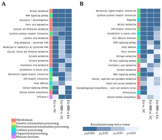 Top 20 ranked KEGG pathways from the KEGG enrichment analysis of DEGs. Plots (A) are samples from day 4 post-infection, and plots (B) are samples from day 6 post-infection. NC, uninfected control; EA, E. acervulina; BBR, berberine; KEGG, Kyoto Encyclopedia of Genes and Genomes; DEGs, differentially expressed genes.