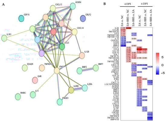 The protein–protein interaction (PPI) network and heatmap in cytokine–cytokine receptor interactions. (A) DEGs in the cytokine–cytokine receptor interaction term were obtained between groups (EA vs. NC) at 6 dpi. PPI analysis was performed using STRING. (B) Heatmap in cytokine–cytokine receptor interactions. The numbers in square boxes represent the expression levels of DEGs filtered by log2 fold change ≥2, p-adj false discovery rate <0.05. DPI, day post-infection; NC, uninfected control; EA, E. acervulina; BBR, berberine; DEGs, differentially expressed genes.