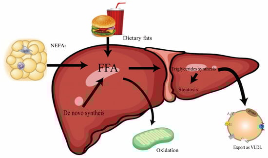 Studies have shown that non-esterified fatty acids (NEFAs) can act as a signal molecule involved in the gene expression of lipid metabolism [161]; plasma NEFA is the main substrate for hepatic triglyceride esterification and secretion, providing most of the fatty acids secreted by the liver in VLDL particles, and the proportion is more than 60% of total hepatic triglycerides secreted in the form of VLDL [162,163]. Many early studies have shown that increased plasma NEFA levels lead to increased VLDL–triglyceride secretion, so plasma NEFA pools are the only source of FAs for VLDL–triglyceride synthesis [164,165]. However, high plasma NEFA levels or concentrations do not necessarily significantly contribute to increased VLDL–triglyceride secretion [166]. Morten B Krag et al. [167] investigated the relationship between GH, FFA, and VLDL-TG in nine healthy men in a randomized, double-blind, placebo-controlled trial. It can be seen from the results that an increase in FFA flux is not necessarily related to an increase in VLDL-TG production in healthy men. Lei Liu et al. [168] verified in vitro experiments of bovine hepatocytes that high concentrations of NEFA could significantly inhibit the expression of ApoB-100, ApoE, MTP, and LDLR, leading to the synthesis and assembly of VLDL and inducing the accumulation of TG in bovine hepatocytes.