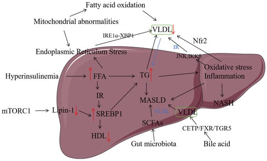 The relationship between the pathogenesis of MASLD and VLDL. VLDL (very low-density lipoprotein); FFA (free fatty acid); IR (insulin resistance); SREBP-1C (Sterol Regulatory Element Binding Protein-1C); HDL (high-density lipoprotein); TGs (triglycerides); SCFAs (short-chain fatty acids); CETP (Cholesteryl Ester Transfer Protein); FXR (Farnesoid X Receptor); TGR5 (TGR5 Bile Acid Receptor); JNK (c-Jun N-terminal kinase); IKKβ (IκB Kinase β); Nrf2 (nuclear factor E2-related factor 2); IRE1α-XBR1 (Inositol-Requiring Enzyme 1 alpha–X-Box Binding Protein 1). Note: ↑ indicates an increase in content, and ↓ indicates a decrease in content.