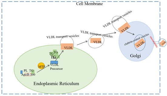 The biosynthesis of VLDL primarily occurs within the lumen of the endoplasmic reticulum (ER), which can be roughly divided into two main steps [106]. First, the formation of VLDL precursors is a critical initial step. ApoB-100 is synthesized in the ER lumen through co-translational translocation, and MTP (microsomal triglyceride transfer protein) mediates the covalent binding of lipids (TG, CE) to ApoB, forming lipid-deficient pre-VLDL particles (pre-VLDL). MTP not only plays a role in the assembly of VLDL precursors but is also essential for the stability of ApoB, Additionally, Hsp110 interacts with ApoB to inhibit its ubiquitination and degradation and ensure the stability of precursor particles [107]. VIGILIN [108], TIA1-like 1 (TIAL1), and Human antigen R (HUR) [109] affect ApoB synthesis and VLDL secretion by regulating the translation and splicing of ApoB mRNA, respectively. These original VLDL particles, known as pre-VLDL, then enter the next step of maturation.