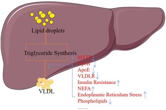 Impaired VLDL secretion may be caused by mutations or defects of proteins (ApoB, MTTP, ApoE) essential for VLDL production, insulin action, the lack of the major phosphatidylcholine of the VLDL surface lipid, and possible fatty acid (FA) and non-esterified fatty acids (NEFA), or endoplasmic reticulum stress. Other factors such as phosphatidylcholine (PC) and cholesterol esters (CEs) also affect VLDL synthesis [118,119,120]. Refer to Figure 5 for details.