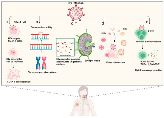 The pathogenesis of HIV-associated lymphoma (HAL). (a) HIV infection targets the CD4+ T cells, entering to replicate internally, leading to cell depletion and eventually triggering a severe immunodeficiency in the body that drives lymphomas; (b) HIV infection destabilizes the genomic instability, leading to chromosomal aberrations, DNA recombination, and ultimately driving lymphomagenesis; (c) HIV itself and various HIV-encoded proteins, including p17, nef, tat, gp120, act directly on follicular germinal center aggregates in lymph nodes to drive lymphomas; (d) impaired immune surveillance of T cells after HIV infection increases the chances of tumorigenesis driven by oncogenic viruses such as EBV and KSHV, leading to lymphomagenesis; (e) HIV infection causes chronic antigen activation and B-cell activation, long-term chronic inflammation, and the overproduction of various cytokines that promote the development and growth of lymphoma. The solid arrows (↑) represent elevated. Created in BioRender. Xuejiao Shu. (2025) https://app.biorender.com/illustrations/67f232faa3efd15ebf9d87de.