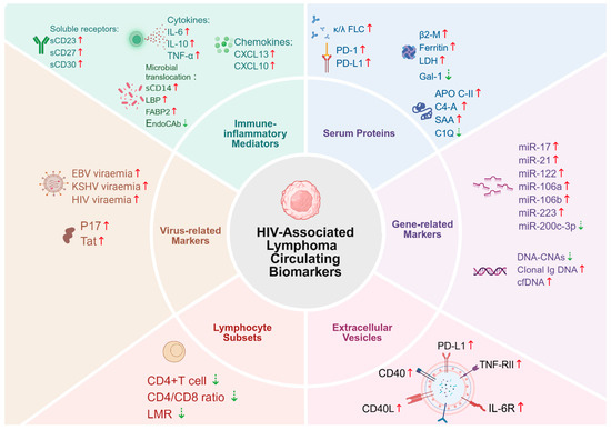 Due to its accessibility and minimally invasive nature, blood is widely used for biomarker screening and validation in precision oncology medicine [41]. The development of HAL is closely associated with alterations in various plasma metabolites. In recent years, studies have demonstrated that serum cytokines, chemokines, soluble receptors, and serum proteins play crucial roles in the early stages of disease progression, risk prediction, and prognostic evaluation. Moreover, emerging molecular biomarkers such as circulating miRNAs, extracellular vesicles (EVs), and clonally rearranged Ig DNA have further expanded the research landscape of plasma metabolite changes. Immunological dysfunction, persistent HIV viremia, and sustained expression of HIV-encoded viral proteins together contribute to altered plasma metabolic profiles, thereby promoting tumor microenvironment (TME) remodeling and immune evasion. Figure 2 categorizes and presents six classes of circulating biomarkers associated with the occurrence, progression and prognosis of HAL.