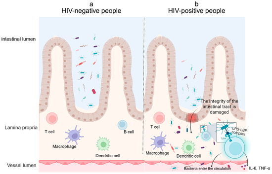 The disruption of intestinal barrier integrity and microbial translocation in HIV-positive individuals. (a) In HIV-negative individuals, an intact gut epithelial barrier effectively prevents microbial products from entering the circulation; (b) HIV infection damages the gastrointestinal epithelium, leading to increased permeability and allowing bacterial products such as LPS to translocate into the lamina propria and bloodstream. LPS forms complexes with LBP, which activate the TLR4/NF-κB signaling pathway and trigger the release of inflammatory cytokines including IL-6 and TNF-α, promoting lymphomagenesis.Created in BioRender. Xuejiao Shu. (2025) https://app.biorender.com/illustrations/67f68ca3b9e5bb8ed54bd2ff.