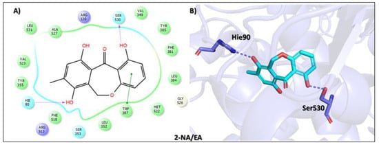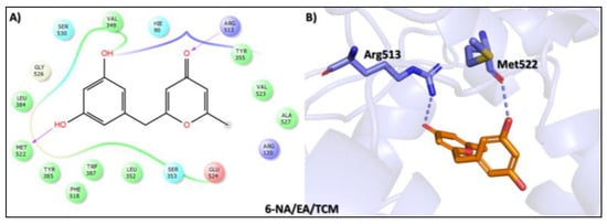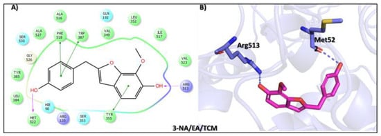 Tophit 3 (2-(p-hydroxybenzyl)-7-methoxybenzofuran-6-ol) [46]![]() | −9.760 | OH(Phenol) | Met522 | HB |