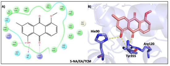 Tophit 5 (1-hydroxy-5-methoxy-3-methyl-9,10 dihydroanthracene 9,10-dione) [48]![]() | −8.742 | OH(Methylphenol) | Arg120 | |