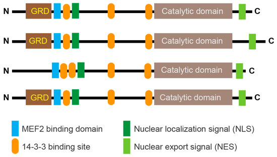 69. McKinsey, T.A.; Zhang, C.L.; Olson, E.N. Identification of a signal-responsive nuclear export sequence in class II histone deacetylases. Mol. Cell. Biol. 2001, 21, 6312–6321. [Google Scholar] [CrossRef] [PubMed]