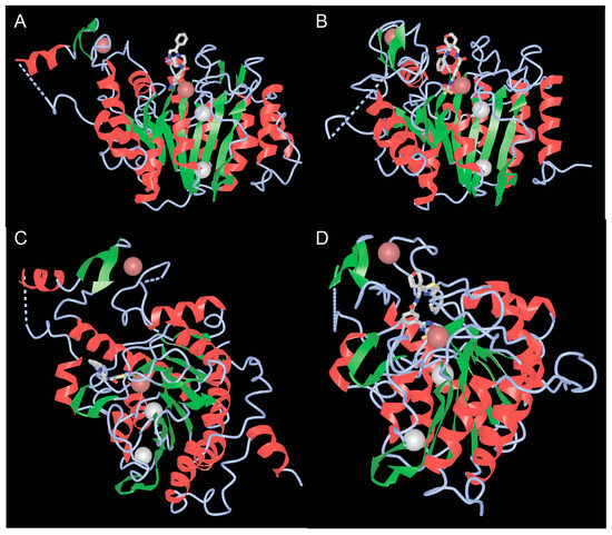 Figure 4. The catalytic domains of class IIa HDACs. (A,B) View of the catalytic domains of HDAC4 (A) and HDAC7 (B) showing the catalytic pocket with the coordinated zinc and adjacent potassium ions. (C,D) Rotated view of the class IIa catalytic domain highlighting the second structural zinc ion and the structural zinc-binding domain (sZBD) of HDAC4 (C) and HDAC7 (D). PDB ID 2VQM. https://www.ncbi.nlm.nih.gov/Structure/icn3d/full.html?&mmdbid=65359&bu=1&show-199%20anno=1&source=full-feature, 3 June 2025. The α-helices are shown in red and β-strands in green.