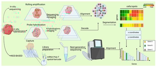 ST techniques can be broadly classified into two main categories: imaging-based and sequencing-based techniques [20,21]. The fundamental distinction between these two classes lies in their divergent methodologies for determining the spatial location and abundance of specific mRNA molecules within tissues. Imaging-based techniques leverage fluorescence characteristics and their corresponding intensities to decipher target genes and their respective abundances. Conversely, sequencing-based techniques rely on spatial barcodes present on arrays to retrieve the spatial positions of target genes in tissues and utilize next-generation sequencing (NGS) technologies to ascertain their expression levels (Figure 2). Under each of these two overarching techniques, numerous distinct sequencing methods can be further delineated.