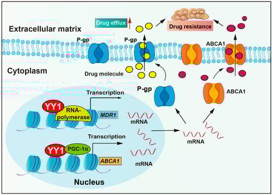 Anti-tumor drugs require sufficient cellular concentrations to achieve therapeutic efficacy. However, tumor cells could actively reduce intracellular drug concentration by overexpressing pump proteins, thereby enhancing drug efflux. Drug transporter mediated efflux, particularly by ATP-binding cassette (ABC) proteins, is the most clinically significant drug efflux mechanism. ABC transporters utilize ATP-derived energy to drive the active translocation of various substrates. Numerous studies have unequivocally identified ABC transporters as pivotal players in mediating cancer multidrug resistance (MDR) development, such as P-glycoprotein (P-gp, also named MDR1), multidrug resistance-associated protein 1 (MRP1), and breast cancer resistance protein (BCRP) [31]. P-gp, encoded by the multidrug resistance-1 (MDR1) gene, is a central member of the ABCB subfamily within the ABC transporter family. P-gp actively extrudes therapeutic agents and is overexpressed in most cancers (colorectal cancer, breast cancer, glioma, lung cancer, and others), and it has been confirmed to correlate with clinical drug resistance [32]. Studies have revealed that YY1 binds to the promoter of the MDR1 gene, enhancing transcriptional activity and upregulating P-gp protein expression, thereby reducing cellular sensitivity to multiple chemotherapeutic agents, including vincristine, cytarabine, and adriamycin (Figure 1) [33,34,35]. Moreover, clinical studies show that YY1 correlates positively with P-gp expression in acute lymphoblastic leukemia (ALL), with high YY1 expression patients exhibiting significantly lower 5-year overall survival rates [34,36]. In addition, a study demonstrated that the bendamustine hydrochloride (BH) resistant mantle cell lymphoma (MCL)-derived subline KPUM-YY1R showed significant upregulation of MDR1 mRNA and cross-resistance to vincristine and cytarabine. Moreover, the restoration of BH sensitivity in KPUM-YY1R cells through P-gp inhibition confirmed that YY1 drives chemoresistance in tumor cells by upregulating MDR1 gene expression and amplifying drug efflux capacity [33]. YY1 cooperates with transcriptional coactivator PGC-1α and then enhances transcriptional activity of the ATP-binding cassette transporter 1 (ABCA1) gene, resulting in elevated ABCA1 expression levels, leading to insensitivity of colorectal cancer cells to isoliquiritigenin and tumor metastasis [37].