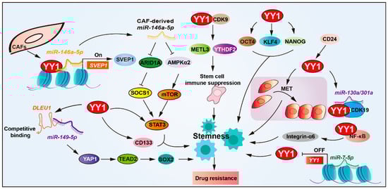 YY1 is also involved in modulating TME to support CSC-mediated resistance. In bladder cancer, the extracellular matrix protein SVEP1, a matrix-type CAF marker, has been implicated in chemoresistance. Mechanistically, miR-146a-5p enhances YY1 recruitment to upregulate SVEP1 expression in CAFs and enhances CSCs’ properties, and depletion of either miR-146a-5p or SVEP1 significantly sensitized urothelial bladder carcinoma (UBC) cells to gemcitabine–cisplatin combination therapy both in vitro and in vivo [7,72].