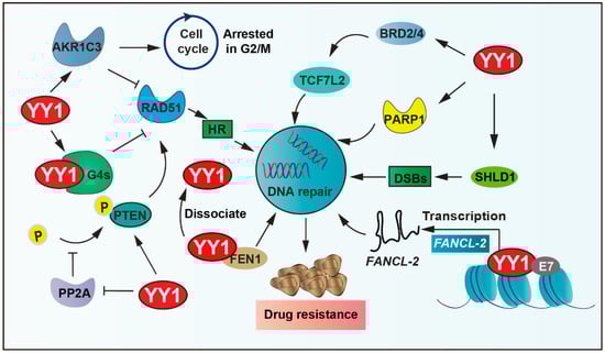 RAD51 recombinase, an ATPase, assembles into a nucleoprotein filament on single-stranded DNA, which is a crucial player in the HR process, including searching for homologous sequences and strand exchange. YY1 binds to guanine quadruplexes’ (G4s) structures, which restricts RAD51 access and thereby shields excessive HR activity, ultimately protecting genomic stability [83]. YY1 also upregulates various DNA-repair-related proteins, including PTEN and RAD51. YY1 reduces the phosphorylation of PTEN by inhibiting the activity of protein phosphatase 2A (PP2A), thus ensuring the fidelity of the DNA repair process [84]. Moreover, the shieldin complex shields double-strand DNA breaks (DSBs) from nucleolytic resection. YY1 inhibits SHLD1 transcription, thereby leading cross-resistance to poly ADP-ribose polymerase (PARP) inhibitor and cisplatin in breast cancer susceptibility gene 1 (BRCA1)-deficient ovarian cancer cells [85]. In addition, bromodomain and extraterritorial domain family factors modulate the expression of several genes related to carcinogenesis. It is overexpressed in many types of cancer and associated with the resistance of tumor cells to chemotherapeutic drugs [86,87]. YY1 recruits BETs (including BRD2, BRD4) to bind to cis-regulatory elements of transcription factor 7 like 2 (TCF7L2), thereby regulating the expression of TCF7L2, cooperatively activating tumor cell DNA repair capacity and driving therapeutic resistance [88,89].