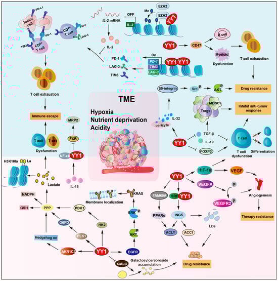 Tumor immunity is another critical factor in reshaping the TME. Immune cells within the TME, such as T cells (Tregs), B cells, NK cells, and macrophages, modulate tumor behavior by secreting cytokines, altering angiogenesis, and reshaping metabolic profiles [120,121]. Compelling evidence indicates that YY1 modulates tumor immunity by regulating immune checkpoint molecules, influencing T cell differentiation and function, and modulating myeloid-derived suppressor cell (MDSC) polarization [16,48]. YY1 directly transcriptionally activates PD-L1, LAG-3, and TIM3 transcription, which induce T cell exhaustion across various cancer types while enhancing tumor resistance to cisplatin and other chemotherapeutic agents [122]. Additionally, YY1 upregulates CD47 expression, inhibiting macrophage phagocytosis, facilitating tumor cell immune escape, and contributing to treatment resistance [123]. Moreover, YY1 also regulates immunosuppressive molecules, such as cytotoxic T-lymphocyte antigen 4 (CTLA-4), promoting the immunosuppressive function of regulatory T cells and inducing a tolerogenic phenotype in myeloid cells [123]. Regarding drug resistance mechanisms, YY1 not only mediates immune escape through immune checkpoints but also coordinately regulates tumor metabolism. For example, YY1 activates Hexokinase 2 (HK2)/pyruvate dehydrogenase kinase-1 (PDK1) to promote glycolysis, so that tumor cells generate excessive lactic acid, and impairs T cell function, expands regulatory T cells, and fosters an immunosuppressive microenvironment, thereby enhancing tumor cell resistance to both chemotherapy and immunotherapy.