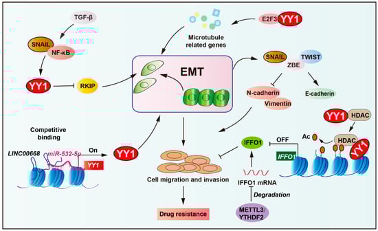 Long non-coding RNAs, such as LINC00668, can promote EMT by regulating YY1 expression via competitive binding to miR-532-5p, thereby enhancing cell proliferation, migration, and invasion [148]. Moreover, YY1 cooperates with transcription factor 3 (E2F3) proteins to enhance the expression of microtubule-related genes, promote the ovarian cancer cell mesenchymal transition, and increase the resistance to paclitaxel and docetaxel [149]. In ovarian cancer, intermediate filament family orphan 1 (IFFO1) suppresses tumor metastasis and cisplatin resistance by inhibiting β-catenin nuclear translocation. Specifically, YY1 recruits histone deacetylase 5 (HDAC5) to the IFFO1 promoter, suppressing its expression, resulting in metastasis and cisplatin resistance [150]. Collectively, these findings identify YY1 as a critical nexus between EMT and treatment resistance, reinforcing its therapeutic potential in malignancies driven by EMT.