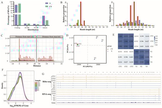 RNA-seq and Ribo-seq data of yak testes. (A) Distribution of RFs for CY and Y; (B) CY (left) and Y (right) RF alignment codon distribution map. (C) Distribution of trinucleotides. (D) PCA plot of samples. (E) Sample correlation heatmap. (F) Log10FPKM distribution of Ribo-seq data. (G) IGV browser view showing global RNA-seq and Ribo-seq landscape of yak and cattle–yak testicles.