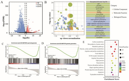 The difference in gene translation levels between CY and Y testes. (A) DTG volcano map between CY and Y. (B) GO enrichment bubble plot of CY and Y DTGs. GSEA of spermatogenesis (C) and gamete generation (D) gene sets showing the normalized enrichment score (FDR, false discovery rate; positive and negative normalized enrichment scores indicate higher and lower expression in CY, respectively). (E) KEGG enrichment bubble plots of CY and Y DTGs.