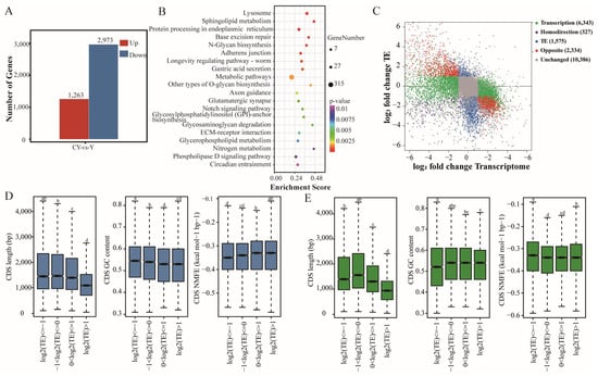 Differences in TE between CY and Y testicular genes. (A) Statistics of DTEGs for yak and cattle–yak. (B) KEGG enrichment bubble plot of DTEGs. (C) Comparison and classification chart of TE differences and transcriptional differences for genes between yak and cattle–yak. Differences in CDS length, GC content, and normalized minimum free energy (NMFE) among the four TE groups of yak (D) and cattle–yak (E), with significant differences represented by different letters (p < 0.05).