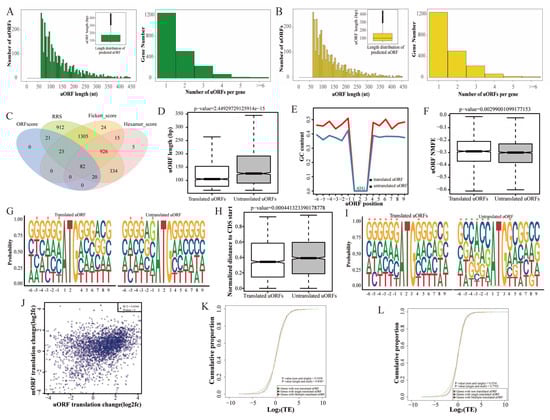 uORF features. Distribution of the number and length of uORFs in yak (A) and cattle–yak (B). (C) Potentially translated uORF screening. Comparison of the length (D), GC content (E), NMFE (F), Kozak sequence (G), and distance to the start of the CDS from (H) translated and untranslated uORFs in yak. (I) Comparison of Kozak sequences of yak uORFs and mORFs (* represents p < 0.05). (J) Scatter plot of differential changes in yak uORFs and downstream mORFs. (K) Cumulative curve of the effect of different types of uORFs on TE in yaks (K) and cattle–yaks (L).