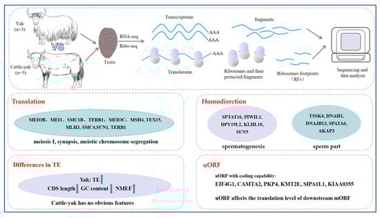 Hybrid male sterility is a postzygotic reproductive isolation mechanism. In mammals, it refers to the infertility of heterogametic sex (male) offspring produced by interspecies hybridization due to their inability to generate functional gametes [1]. The cattle–yak (Bos taurus (♂) × Bos grunniens (♀)) combines the advantages of yaks, such as their adaptation to the high-cold and low-oxygen environment, ability to tolerate roughage, and strong disease resistance, with those of cattle, such as a fast growth rate and high meat production performance, and plays an increasingly important role in plateau animal husbandry [2,3,4]. However, male cattle–yaks are sterile due to abnormal spermatogenesis, which restricts the utilization of heterosis and has become the biggest obstacle to yak crossbreeding. Research shows that with the increase in backcross generations, cattle–yaks become completely fertile by the F4 generation, but their economic value is greatly reduced [1]. Elucidating the molecular mechanisms underlying hybrid reproductive barriers is crucial for enhancing the reproductive performance of hybrid species. Previous studies investigating the mechanisms underlying male infertility in cattle–yak have primarily focused on the transcriptional level. These studies revealed altered expression of genes associated with spermatogonial stem cell maintenance, cell differentiation, and meiosis in the cattle–yak [5,6,7,8,9]. However, the abundance of proteins is what ultimately determines the phenotype, and the translation level is the determinant of protein abundance [10]. The half-life, synthesis rate, and quantity of proteins and mRNA significantly differ. Changes in transcript levels can often be buffered or compensated for at the protein level [11,12]. However, the resolution of protein mass spectrometry is limited compared with nucleic acid sequencing methods [13]. Ribosome profiling sequencing (Ribo-seq) can resolve this dilemma. Ribo-seq can achieve single-codon-level resolution and obtain translation information on the genes, such as information on the ribosome distribution, starting codon position, programmatic frame shifts, and upstream open reading frames (uORFs) [14]. Ribo-seq can also be used to infer the instantaneous protein synthesis rate. Ribo-seq data combined with mRNA-seq data can be used to determine the translation efficiency (TE); potential functional micropeptides can also be identified [13].