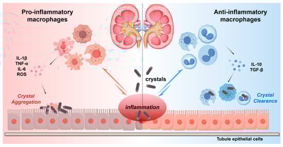 The pathological progression of nephrolithiasis is closely related to the activation and polarization of macrophages [28]. In hyperoxaluric conditions, renal tubular epithelial cells injured by CaOx crystals release damage-associated molecular patterns (DAMPs) and chemokines (e.g., MCP-1, IL-8), which recruit circulating monocytes to the site of injury [29,30]. Once at the injury site, these circulating monocytes differentiate into macrophages to clear the crystals. However, when the crystal load exceeds the macrophages’ processing capacity, the crystals cannot be cleared in a timely manner, potentially leading to a local pro-inflammatory response [31,32]. In a pro-inflammatory environment, macrophages further release pro-inflammatory cytokines, such as IL-1β and IL-8, which, by amplifying the immune response, may reinforce the negative effects on crystal formation, thereby accelerating crystal-to-stone transformation [33]. In this context, macrophages can polarize into either the pro-inflammatory type or the anti-inflammatory type, which inhibits inflammation. Meanwhile, studies have shown that the proportion of M1-type macrophages is significantly increased in the papillary region of the kidneys of stone-forming patients compared to those without stones. This increase is further aggravated by the accumulation of mineral deposits. On the other hand, if there is an accumulation of anti-inflammatory factors in the local environment of the renal papilla, such as increased levels of IL-10 and TGF-β, macrophages may polarize into the M2 type. M2 macrophages then exhibit functions of inhibiting the inflammatory response and promoting tissue repair, which may contribute to the dissolution and natural expulsion of stones to some extent [34].