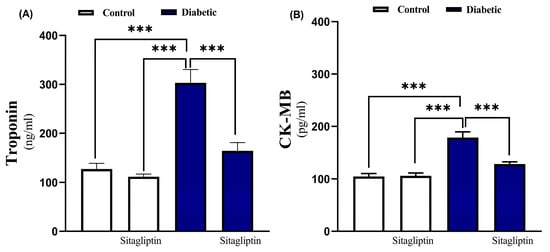 Figure 2. Sitagliptin improved serum level of cardiac biomarkers (A) Troponin1 and (B) CK-MB) in diabetic rats. Data are mean ± SEM, (n = 8). (*** p ≤ 0.001). Abbreviations: CK-MB, Creatine Kinase-MB; SEM, standard error of the mean.
