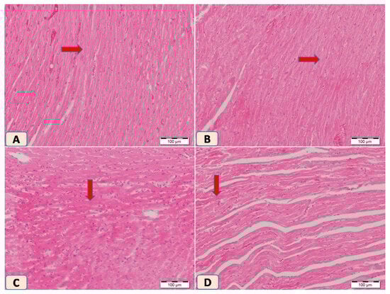Figure 4. Photomicrographs of H&E-stained heart sections. (A) Control heart tissue showing normal myocardium (arrow). (B) Heart section from rats that received sitagliptin shows normal heart tissue (arrow). (C) Heart section from rats exposed to STZ showing multiple large patches of degenerated cardiac muscle cells and the cytoplasm is dark acidophilic with many pyknotic cells (arrow). (D) Heart section from rats exposed to STZ and treated with sitagliptin shows that most of the cardiac muscle cells were apparently normal, with few cells showing cytoplasmic degeneration (arrow). Magnification ×100.