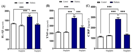 Figure 6. Sitagliptin downregulated cardiac inflammatory biomarkers IL-1β (A), TNF-α (B), and CRP (C) in diabetic rats. Data are mean ± SEM, (n = 8). (*** p < 0.001). Abbreviations: IL-1β, interleukin-1beta; TNF-α, Tumor necrosis factor-alpha; CRP, C-reactive protein; SEM, standard error of the mean.