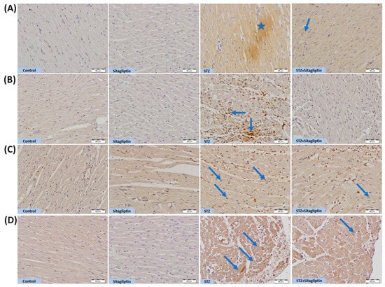 On the other hand, Masson trichrome-stained heart sections from control and sitagliptin groups showed normal amount and distribution of collagen mainly in the endomysium (Figure 5A,B). In dissimilarity, heart sections from rats exposed to STZ showed regeneration of multiple large patches of collagen bundles between cardiac muscle cells (Figure 5C). In contrast, heart sections from rats exposed to STZ and treated with sitagliptin showed apparently normal distribution of collagen bundles which mimic the control one (Figure 5D). Photomicrographs of H&E-stained heart sections showed normal myocardium in control heart tissue and as well in rats that received sitagliptin. Heart sections from rats exposed to STZ showed regeneration of multiple large patches of degenerated cardiac muscle cells; the cytoplasm is dark acidophilic with many pyknotic cells. Lastly, heart sections from rats exposed to STZ and treated with sitagliptin showed that most of the cardiac muscle cells were apparently normal with few cells showing cytoplasmic degeneration. Photomicrographs of Masson trichrome-stained heart sections in the control group showed heart tissue with normal amount and distribution of collagen mainly in the endomysium. Heart sections from rats that received sitagliptin also showed normal amounts of collagen between cardiac muscle fibers. Heart sections from rats exposed to STZ showed regeneration of multiple large patches of collagen bundles between cardiac muscle cells, and heart sections from rats exposed to STZ and treated with sitagliptin showed apparently normal distribution of collagen bundles which mimic the control one.