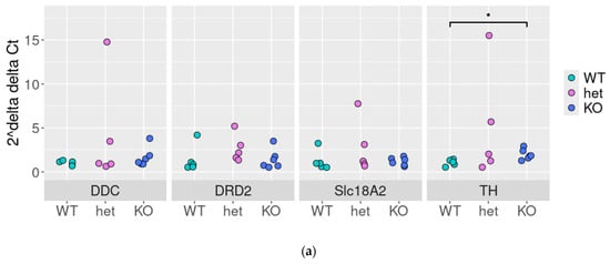 Thus, we tested the stability of these associations (except DAT, which is known to be downregulated in DAT-Het and completely lost in DAT-KO rats) in DAT-WT, DAT-KO, and DAT-Het rat SN samples by qPCR. We identified the slight (~2-fold change, Figure 6a) up-regulation of TH expression in DAT-KO rats (p < 0.05, Figure 6a). Meanwhile, the upregulation of Th mRNA expression levels in DAT-Het rats compared to DAT-WT did not reach statistical significance (p > 0.05).