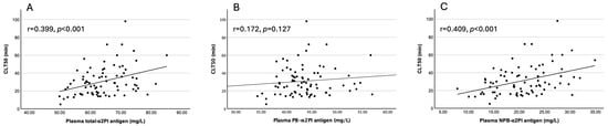 Correlation of plasma (A) total-α2PI, (B) PB-α2PI, and (C) NPB-α2PI levels with CLT50 (n = 80).