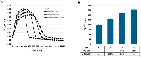 Effect of α2PI forms on clot lysis time. α2PI-deficient plasma was supplemented with recombinant PB- and/or NPB-α2PI; 100% corresponded to the estimated normal plasma concentration of α2PI (65 mg/L). (A) Clot lysis curves; (B) CLT50 values presented as mean ± SD values of 3 parallel measurements.