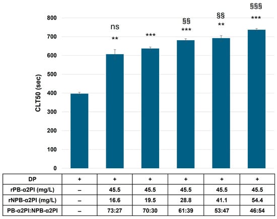 Effect of elevated NPB-α2PI on clot lysis time. α2PI-deficient plasma was substituted with an equal amount of recombinant PB-α2PI and an increasing amount of recombinant NPB-α2PI. CLT50 values are presented as mean ± SD values of 3 parallel measurements. ** p < 0.01 and *** p < 0.001 comparing to α2PI deficient plasma; ns non-significant, §§ p < 0.01 and §§§ p < 0.001 comparing to 70:30 PB-α2PI:NPB-α2PI ratio.