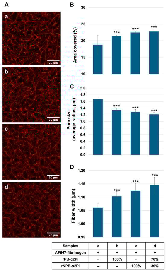 α2PI-deficient plasma supplemented with AF647-labelled fibrinogen, and different amounts of recombinant PB- and/or NPB-α2PI forms were clotted (samples a–d). And the washed clot was analyzed with confocal laser scanning microscopy (A). The percentage of area coverage was determined by Fiji software; pore size and the width of the fibrin fibers were calculated using a MATLAB (R2019a) GUI called CT-FIRE v3.0 beta (curvelet transform–fiber extraction). In the presence of PB and/or NPB forms, area coverage was significantly increased (B), pore size decreased (C), and thicker fibrin fibers evolved (D), therefore becoming a denser fibrin network in clots supplemented with rα2PI compared to the α2PI-deficient clot. 100% α2PI = 65 mg/L *** p < 0.001 comparing to α2PI deficient plasma, n = 22.