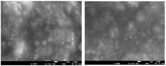 Scanning electron microscope images at 5000× (left) and 1000× (right) of phytosomes loaded with Callistemon citrinus leaf extract.