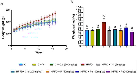 Weekly body weight in control rats and the different experimental treatments during the 16 weeks (A), and the percentage of total weight gained by control rats and various experimental treatments over 16 weeks is shown (B). Values are expressed as mean ± standard deviation (ANOVA followed by Tukey’s test, n = 6). Different letters (a,b) indicate significant differences between groups.
