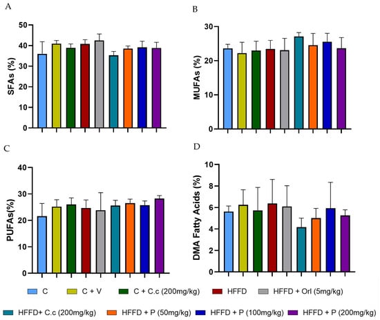 Effect of Callistemon citrinus extract and phytosomes on the lipid profile in brain tissue, (A) saturated fatty acids (SFAs), (B) monounsaturated fatty acids (MUFAs), (C) polyunsaturated fatty acids (PUFAs), and (D) dimethyl acetaldehyde (DMA) fatty acids. Control (C); control + vehicle (C + V); control + C. citrinus leaf extract (C + C.c, 200 mg/kg), high-fat diet (HFD), HFD + orlistat (HFD + Orl, 5 mg/kg), HFD + C. citrinus leaf extract (HFD + C.c, 250 mg/kg), HFD + phytosomes (HFD + P, 50 mg/kg, 100 mg/kg, and 200 mg/kg, respectively). Values are expressed as mean ± standard deviation (ANOVA followed by Tukey’s test, p < 0.05, n = 6).