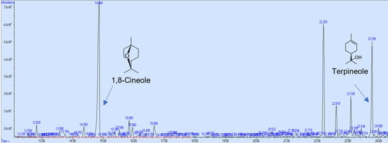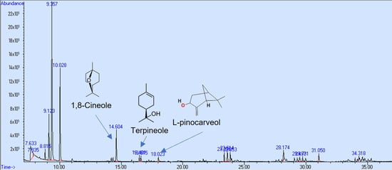 - Satou, T.; Hayakawa, M.; Kasuya, H.; Masuo, Y.; Koike, K. Mouse brain concentrations of α-pinene, limonene, linalool, and 1,8-cineole following inhalation. Flavour Fragr. J. 2017, 32, 36–39. [Google Scholar] [CrossRef]