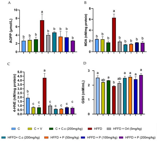 Effect of Callistemon citrinus extract and phytosomes on the generation of oxidative stress markers. Advanced oxidation protein products (AOPPs) (A), malondialdehyde (MDA) (B), 4-hydroxynonenal (4-HNE) (C), and reduced glutathione (GSH) (D). Control (C), control + vehicle (C + V), control + C. citrinus leaf extract (C + C.c, 200 mg/kg), high-fat diet (HFD), HFD + orlistat (HFD + Orl, 5 mg/kg), HFD + C. citrinus leaf extract (HFD + C.c, 250 mg/kg), HFD + phytosomes (HFD + P, 50, 100, and 200 mg/kg, respectively). Values are expressed as mean ± standard deviation (ANOVA followed by Tukey’s test, p < 0.001, n = 6). Different letters (a, b, c) indicate statistically significant differences between groups.