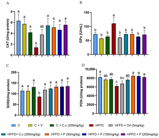 Effect of C. citrinus leaf extract and phytosomes on the activity of catalase (CAT) (A), glutathione peroxidase (GPx) (B), superoxide dismutase (SOD) (C), and paraoxonase (PON) (D) in brain tissue. Control (C), control + vehicle (C + V), control + C. citrinus leaf extract (C + C.c, 200 mg/kg), high-fat diet (HFD), HFD + orlistat (HFD + Orl, 5 mg/kg), HFD + C. citrinus leaf extract (HFD + C.c, 250 mg/kg), HFD + phytosomes (HFD + P, 50, 100, and 200 mg/kg, respectively). Values are expressed as mean ± standard deviation (ANOVA followed by Tukey’s test, p < 0.001, n = 6). Different letters (a, b, c) indicate statistically significant differences between groups.