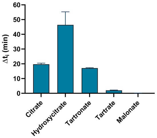Three of the five polyhydroxycarboxylic acids had strong inhibitory effects, but tartaric acid and malonic acid had very weak effects. Hydroxycitrate (∆ti = 46.4 min) had the strongest effect, followed by citrate (∆ti = 19.7 min) and tartronate (∆ti = 17.1 min).