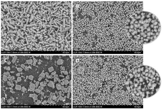 SEM of calcium oxalate crystals isolated after kinetic–turbidimetric assays in artificial urine at 37 °C in the control, without an inhibitor (A), with 2 µM phytate (B), with 2 mM citrate (C), and with 2 mM citrate + 2 µM phytate (D).