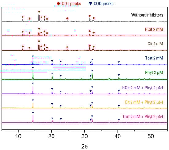 PXRD diffractograms of the same collected crystals were also obtained to determine the crystal phase and composition of the crystals of each experiment. Two phases of calcium oxalate were identified: calcium oxalate trihydrate was present in the crystals obtained from experiments without inhibitors and in the presence hydroxycitrate 2 mM and citrate 2 mM, while calcium oxalate dihydrate was identified in the remaining experiments [27] (Figure 8).
