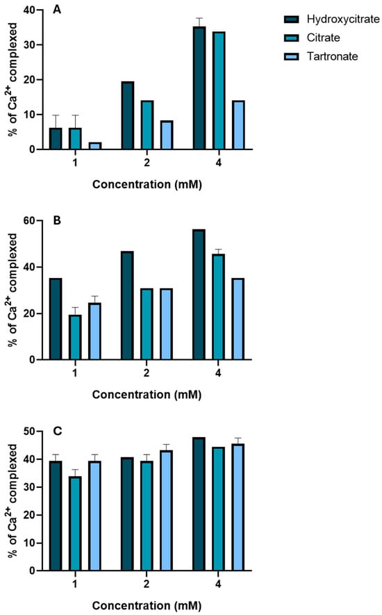 We also evaluated the effect on calcium complexation of three different concentrations (1, 2, 4 mM) of the polyhydroxycarboxylic acids and at three different concentrations of calcium (2.5, 5.0, 10 mM) (Figure 9). The results show that a higher calcium concentration and a greater concentration of each polyhydroxycarboxylic acid led to a greater percentage of complexation. Moreover, the calcium complexation was greatest for hydroxycitrate, followed by citrate and then tartronate.