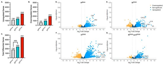 Volcano plot (significance versus fold-change) mapping further supported these findings, highlighting the amplifying effect of dual stressors (hypoxia and HCoV-OC43 infection) on gene expression (Figure 1D–G). The hypoxic HAlone condition caused 1792 genes to be significantly upregulated (blue) or downregulated (yellow), as shown in Figure 1D. The virus infection NOC43 condition (Figure 1E) induced more (2460) changes in gene expression, including a cluster of genes indicative of the activation of immune-related pathways, including upregulation of the mRNAs of proinflammatory genes, such as IL6, CXCL8 and IL1A. The combined HOC43 condition (Figure 1F) had the most pronounced changes in gene expression, with dramatic increases in the number of both up- and downregulated genes compared to either condition alone. A direct comparison between HOC43 and NOC43 (Figure 1G) further confirmed that hypoxia significantly modulated cytokine genes during HCoV-OC43 infection identified in the NOC43 condition, with additional genes of interest being either upregulated or downregulated specifically under the hypoxia plus virus condition.