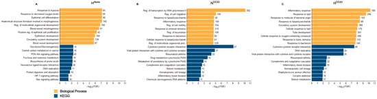 GO pathway enrichment analysis [] provided insight into the biological processes modulated by each experimental condition by categorizing DEGs into different functional gene sets. As expected, in the HAlone condition (Figure 2A), BP enriched terms were primarily related to cellular responses to hypoxia and epithelial cell regulation, while KEGG enriched pathways were associated with metabolic adaptations and hypoxic signaling, confirming that A549 cells were adapting to the hypoxic environment at the transcriptomic level. The NOC43 condition (Figure 2B) enriched GO terms and KEGG pathways associated with immune and inflammatory responses, including “response to lipopolysaccharide”, “inflammatory response”, and “cytokine-cytokine receptor interactions”, reflecting the activation of immune-related processes due to viral infection. In the HOC43 condition (Figure 2C), significant DEGs enriched pathways related to inflammatory responses, with these terms showing a much stronger and more significant enrichment compared to infection in normoxia (NOC43), with the number of genes in shared terms associated with inflammation, for example “inflammatory response”, increasing from 104 in NOC43 to 190 in infected cells in HOC43.