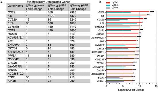 Key genes synergistically upregulated by HCoV-OC43 infection in hypoxia compared to individual conditions included CSF2 (also known as GM-CSF), IL6, CCL20, IL1A, and CXCL8 (also known as IL-8) (Figure 3). Some of the most differentially expressed genes, such as CSF2 or IL6, had very large fold changes into the thousands. This is likely due to the de novo nature of expression, where the levels of mRNA at homeostasis were low or zero, resulting in very high fold-upregulation being observed. Levels of IL-6 protein have previously been shown to increase around 1000-fold during inflammatory events [].
