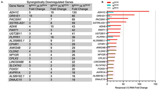 Top synergistically downregulated genes induced by HCoV-OC43 infection of A549 cells in hypoxia. (A) The top 20 genes showing the highest synergistic downregulation in response to HCoV-OC43 infection under hypoxic conditions (n = 4). For this study, synergistic gene downregulation was defined as a reduction in the number of transcripts by more than two-fold in the presence of both hypoxia and HCoV-OC43 infection than the sum of fold changes by either condition alone. The fold changes shown are for HAlone, NOC43, and HOC43, normalized to NAlone. In total, 43 genes were identified as synergistically downregulated, including 29 protein-coding genes, 5 lncRNAs, 7 lincRNAs, and 2 pseudogenes. (B) The bar chart displays the log2-transformed fold changes in mRNA levels for the top 20 synergistically downregulated genes in HOC43 (red), NOC43 (turquoise) and HAlone (gray). Statistical significance between NOC43 and HOC43 was assessed using a Wald test followed by Benjamini–Hochberg correction for multiple testing based on the DESeq2 differential analysis, but no genes were statistically significant. Complete data for all 44 synergistically regulated genes are provided in Supplementary Materials File S1.